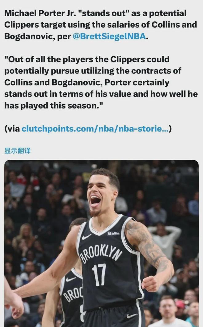 快船得到小波特;魔術(shù)得到卡梅倫-托馬斯;籃網(wǎng)得到杰特-霍華德、科林斯、博格丹諾維奇、26年首輪簽、30年首輪簽、32年首輪互換權(quán)。