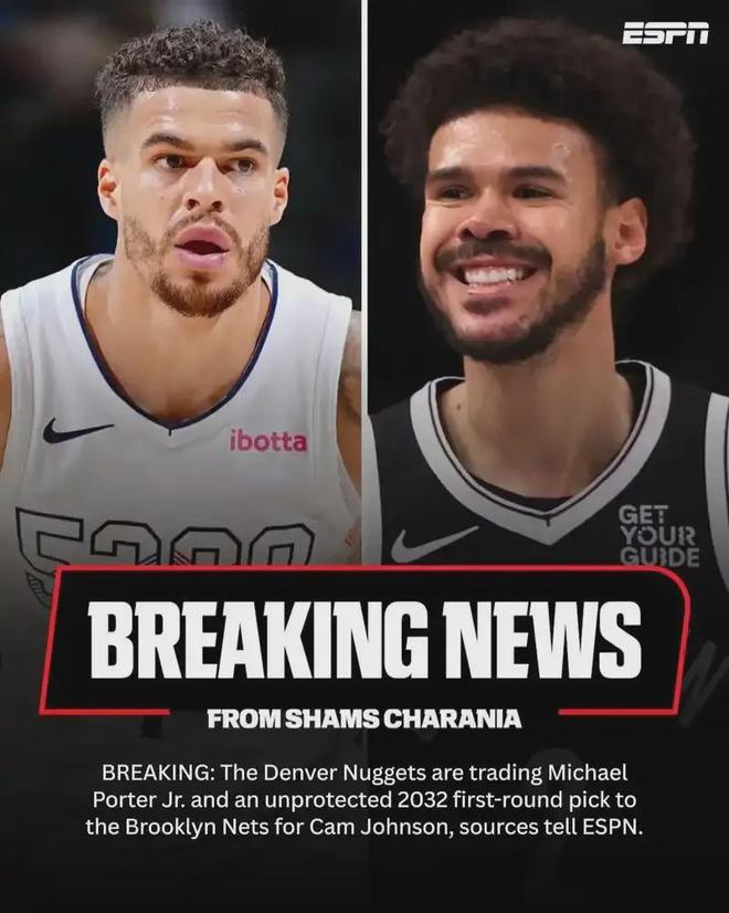 今夏休賽期,掘金放棄了合作七個賽季之久(23年奪冠)的小波特,將他和一個32年無保護首輪簽交易至籃網(wǎng),只為換來卡梅倫-約翰遜。掘金目前以18勝6負高居西部第二,約翰遜在此期間場均11.3分3.4板2.2助進賬。