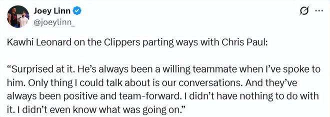此前,快船將保羅深夜遣送回洛杉磯,并宣布將和他分道揚(yáng)鑣一事鬧得沸沸揚(yáng)揚(yáng)。身為球隊(duì)的核心之一,萊昂納德也不可避免地被卷入相關(guān)流言。有報(bào)道稱,萊昂納德和哈登已經(jīng)厭倦了保羅的啰嗦,對(duì)他離開球隊(duì)感到“如釋重負(fù)”。如今,萊昂納德本人談到了自己對(duì)此事的看法。