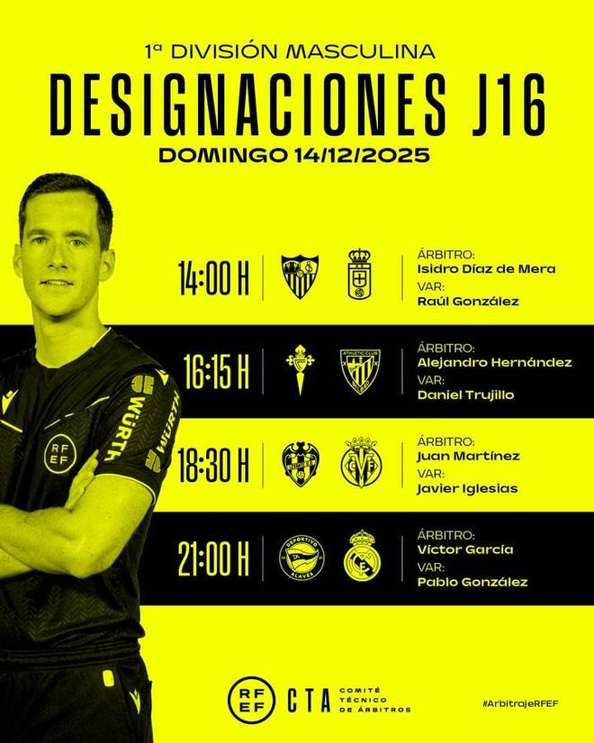 北京時間12月13日,西班牙足協(xié)公布了西甲第16輪明日4場比賽的裁判名單,維克托-加西亞執(zhí)法皇馬客戰(zhàn)阿拉維斯。